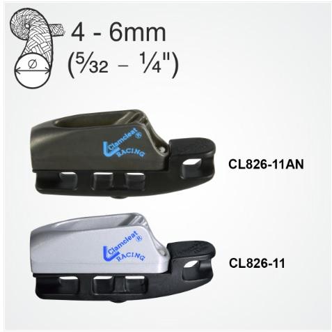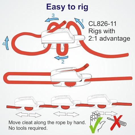 The Clamcleat® CL826-11 ia a strong, compact aluminium cleat rigged on a rope. Easy to rig and adjust. The position of the cleat on the rope can be adjusted by hand. No tools required.